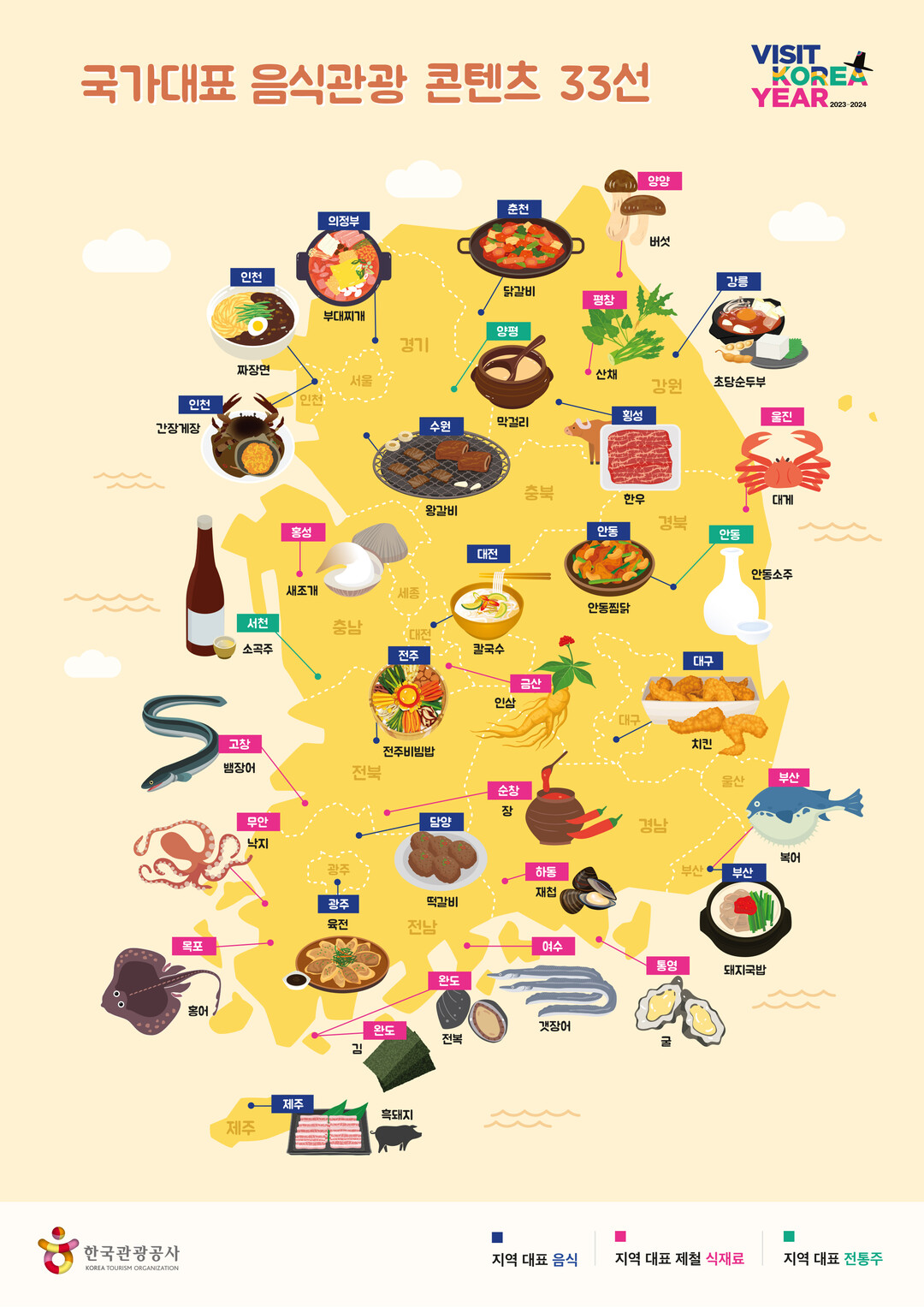 '국가대표 음식관광 콘텐츠 33선'은 △지역대표 음식(15종) △지역 대표 제철 식재료(15종) △지역 대표 전통주(3종) 등 세분야로 나눠 선정됐다.