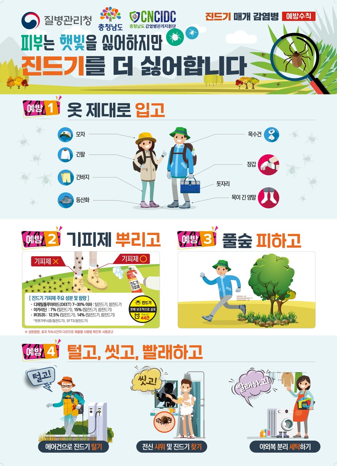 이동유 도 복지보건국장은 "야외 활동 시 진드기 매개 감염병 예방수칙을 준수해 달라"며 "야외 활동 시 진드기에 노출되는 경우가 많은 만큼 도민 대상 지속적인 예방 홍보·교육을 강화할 것"이라고 말했다.