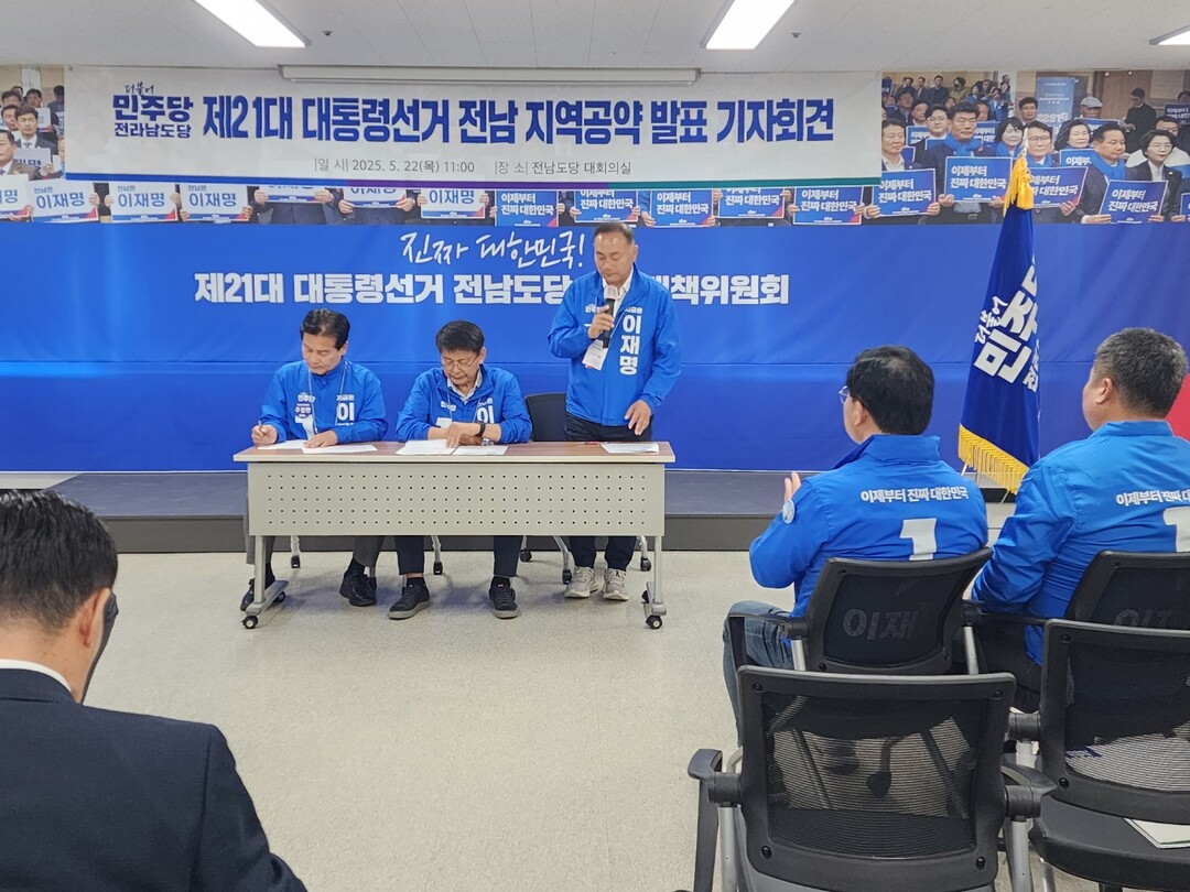 | ▲ 지난달 22일 주철현, 서삼석, 김원이 국회의원이 민주당 전남도당에서 이재명 대선 후보 공약 발표 기자회견을 갖고 있다. [민주당 전남도당 제공] |