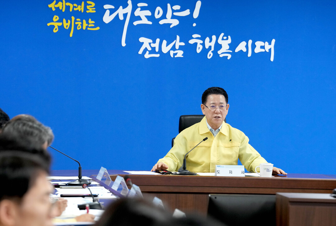 | ▲ 김영록 전라남도지사가 2일 오전 도청 재난종합상황실에서 실·국장과 시군 부단체장들이 영상으로 참석한 가운데 '여름철 폭염 대처상황 점검회의'를 주재하고 있다. [전남도 제공] |