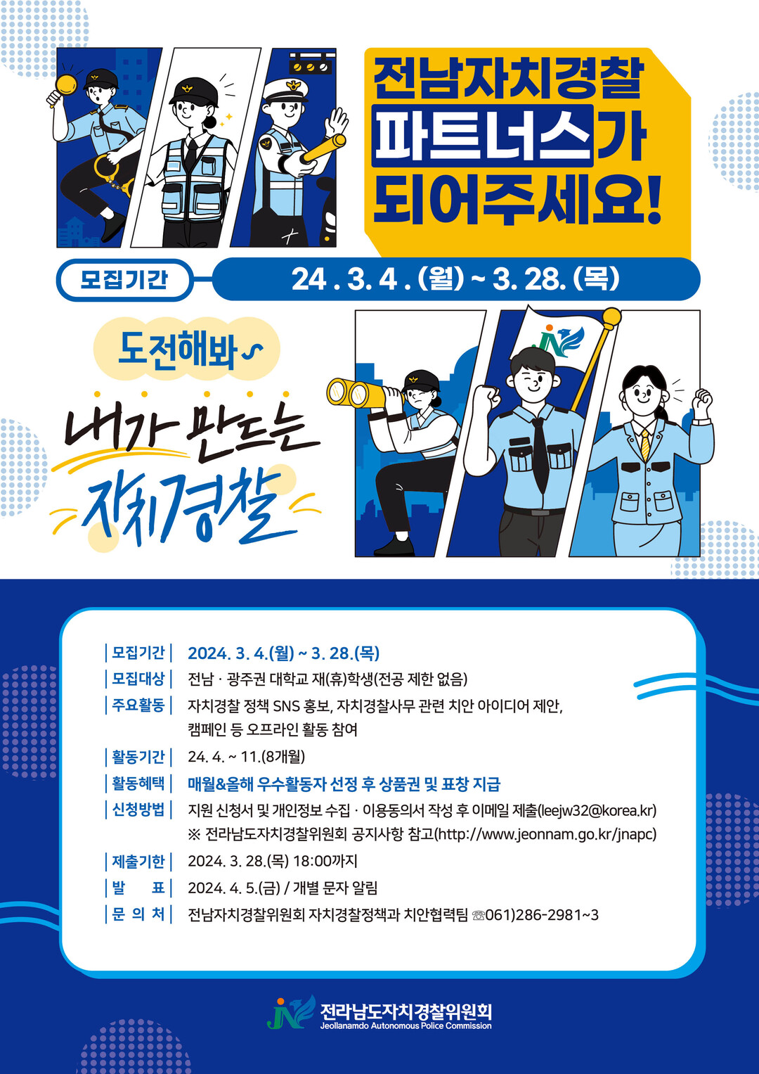 전라남도자치경찰위원회가 자치경찰 홍보와 아이디어를 발굴할 '전남자치경찰 파트너스'를 오는 28일까지 모집한다고 7일 밝혔다.