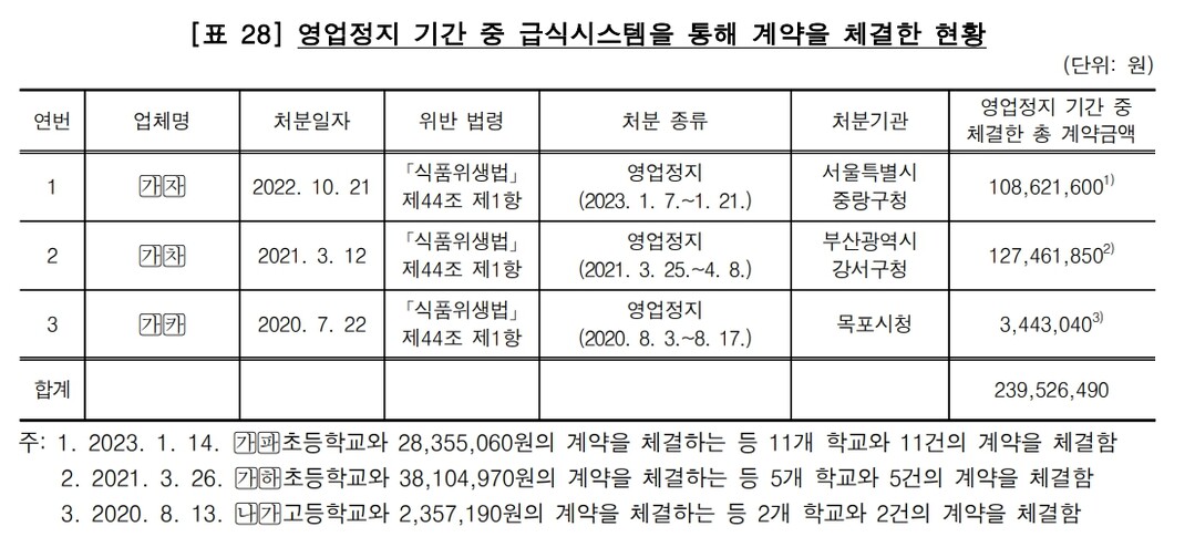 | ▲영업정지 기간 급식시스템으로 계약 체결한 불량업체 현황 [감사원 제공] |