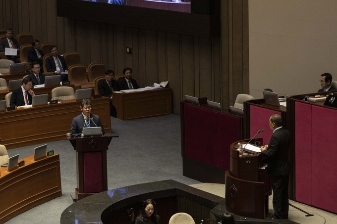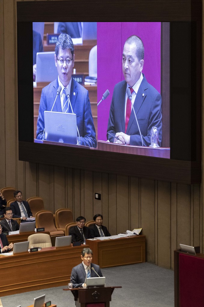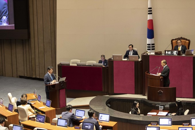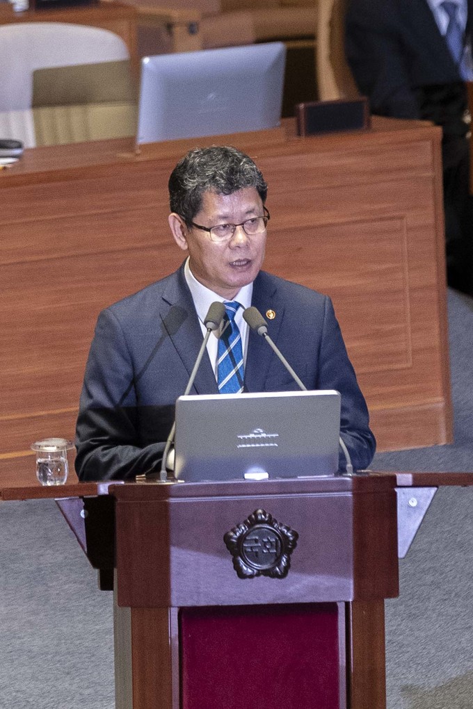 김연철 통일부 장관(왼쪽)이 27일 오후 서울 여의도 국회에서 열린 제371회 국회(정기회)제3차 본회의 대정부질문(외교·통일·안보에 관한 질문)에 출석해 자유한국당 심재철 의원 질의에 답하고 있다.