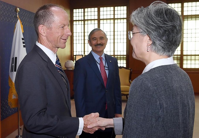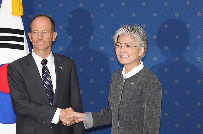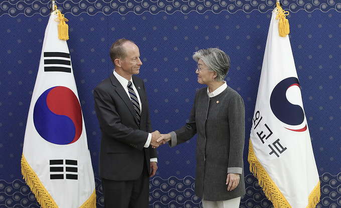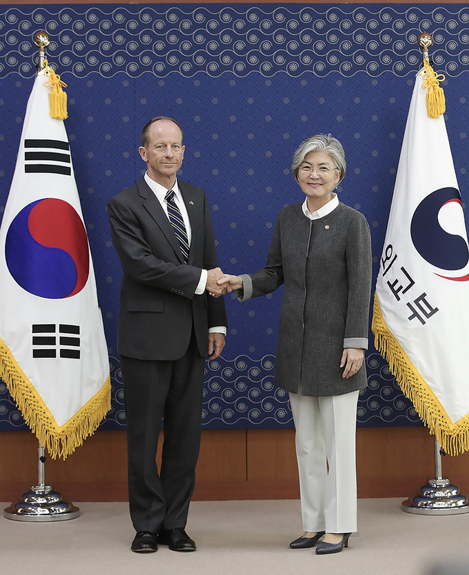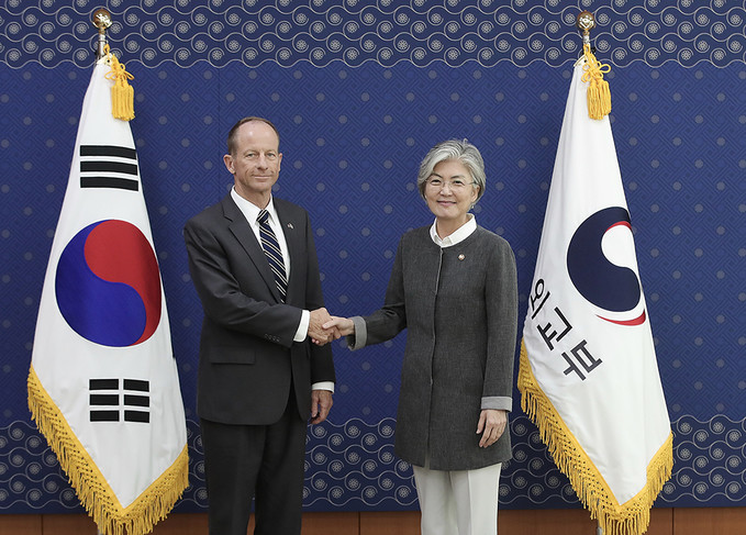 강경화 외교부 장관이 17일 오후 외교부 청사에서 데이비드 스틸웰 신임 미국 국무부 동아시아태평양 차관보와 악수하고 있다.