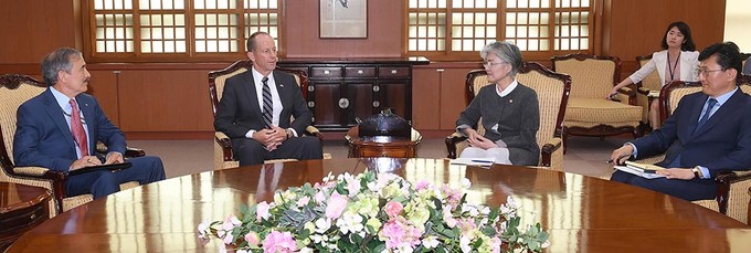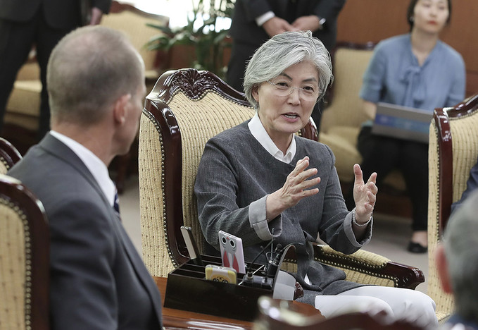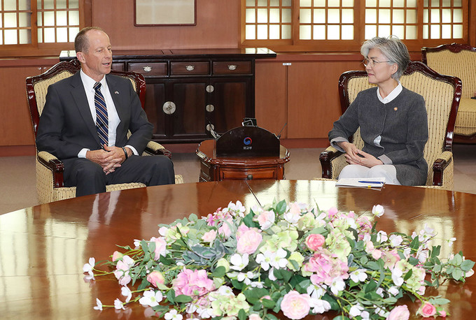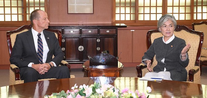 강경화 외교부 장관이 17일 오후 외교부 청사에서 데이비드 스틸웰 신임 미국 국무부 동아시아태평양 차관보와 대화를 하고 있다.