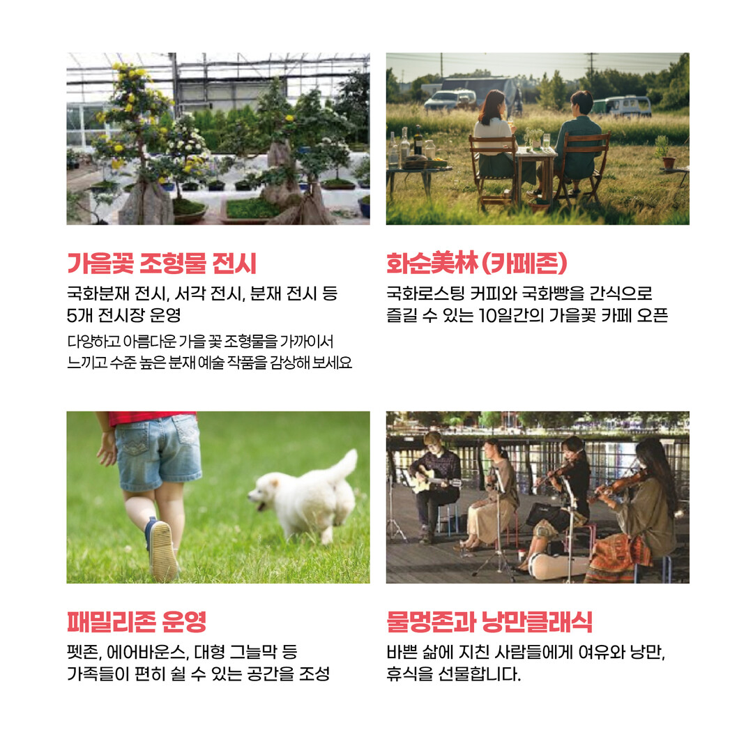 또 국화꽃으로 장식된 하늘그네로 화려함을 만끽할 화순 미림 하늘그네 국화 향연 맞춤 프레임으로 추억 사진을 촬영하는 인생네컷 에어바운스, 공룡탈 쓰기 체험 등의 키즈존 운영 반려동물 보호소·놀이시설 펫존 운영 국화로 장식된 꽃마차를 탈 수 있는 국화 꽃마차 체험 근심을 포토 엽서에 적어 우체통 조형물에 넣어 해소하는 근심 노노 우체통 등 5개 프로그램은 도곡 잔디광장에서 운영된다.