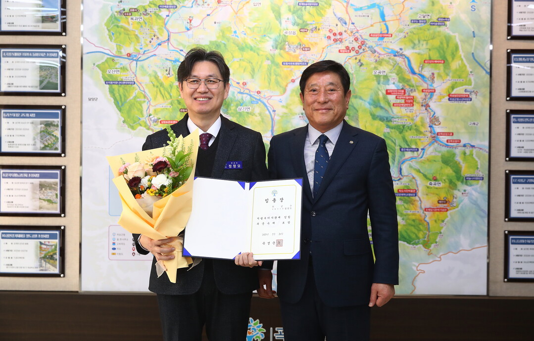 | ▲ 정창모 전남 곡성군 부군수가 조상래 곡성군수로 부터 임용장을 수여받은 뒤 기념촬영을 하고 있다. [곡성군 제공] |