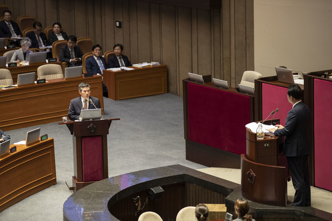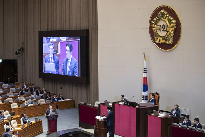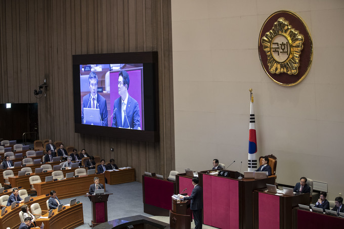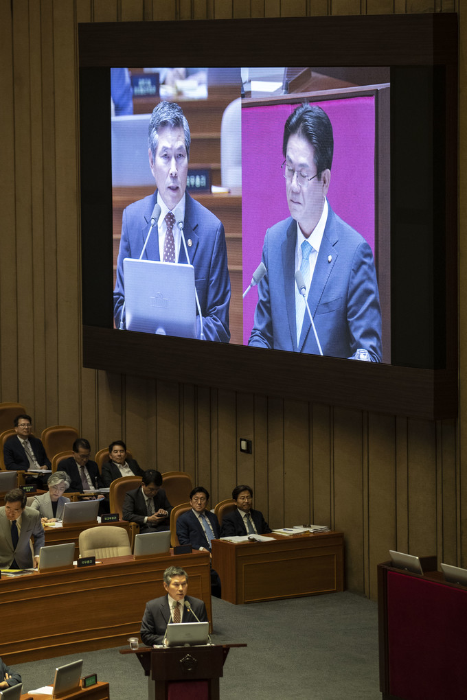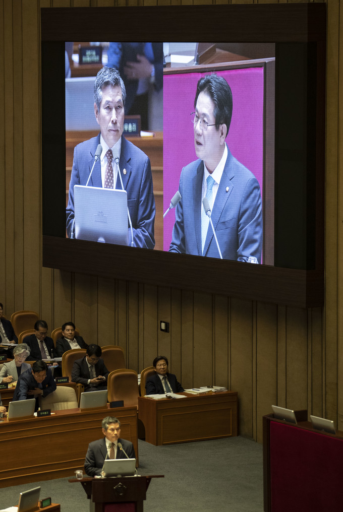 정경두 국방장관(왼쪽)이 9일 오후 서울 여의도 국회에서 열린 본회의 대정부질문에 출석해 바른미래당 이동섭 의원 질의에 답하고 있다.