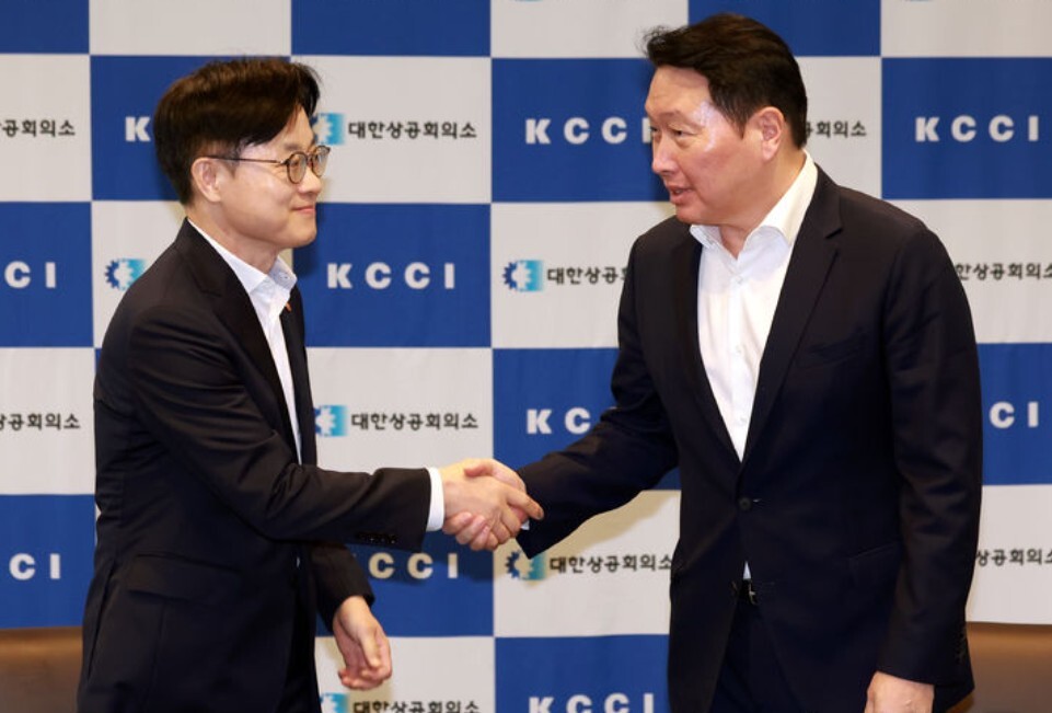 | ▲ 김정관 산업통상자원부 장관(왼쪽)과 최태원 대한상공회의소 회장이 지난 4일 서울 중구 대한상공회의소 대접견실에서 인사를 나누고 있다. [뉴시스] |