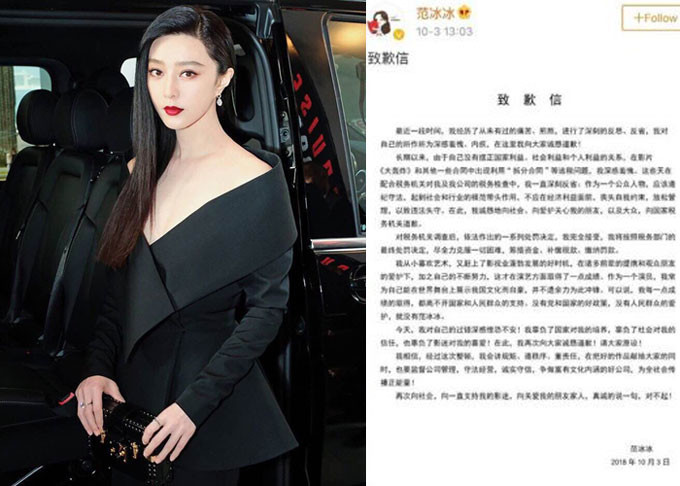 이날 정오 판빙빙은 자신의 SNS에 '탈세혐의 확정'에 대한 사과문을 게재해 잠적 3개월만에 첫 공식입장을 남겼다.
