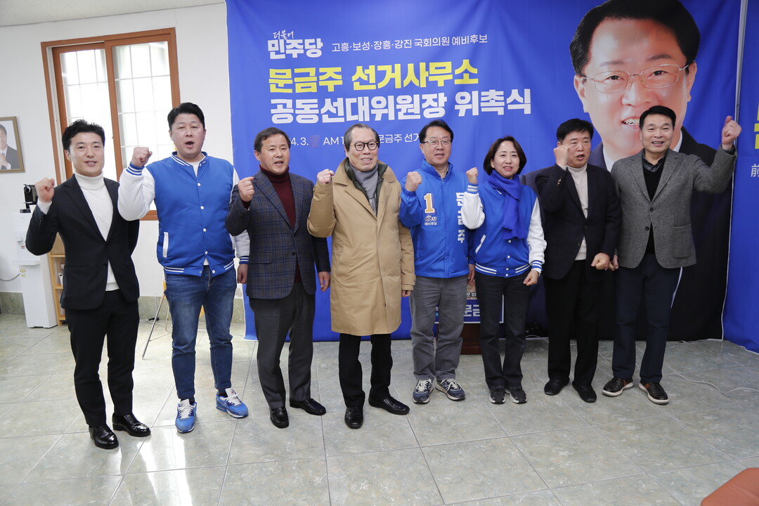 | ▲ 6일 장세선 전 고흥군의회 의장, 김길두 전 대한볼링협회 회장, 이명흠 전 장흥군수, 황호용 대한노인회 강진군지회장이 더불어민주당 고흥,보성,장흥,강진 문금주 예비후보 선거사무실 선거대책위원장으로 위촉된 뒤 기념촬영을 하고 있다. [문금주 후보 사무실] |