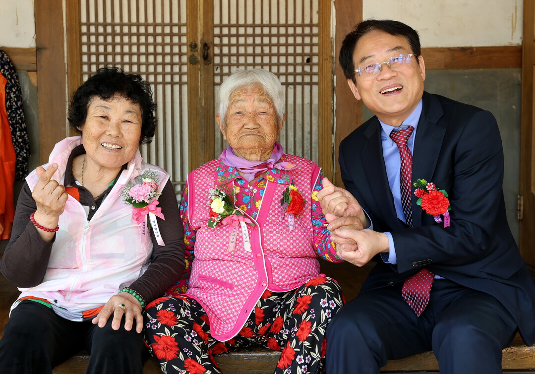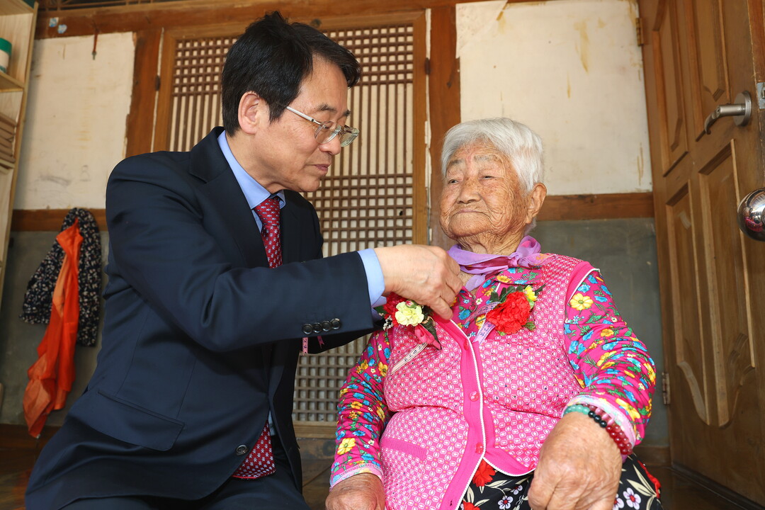 | ▲ 강진원 전남 강진군수가 지난 8일 어버이날을 맞아 100세를 맞은 대구면 청룡마을 전순엽 할머니 집을 직접 방문해 붉은 카네이션을 달아드린 뒤 "어르신, 늘 건강하시고 오래오래 저희 곁에 있어주세요"란 안부를 묻고 있다. [강진군 제공] |