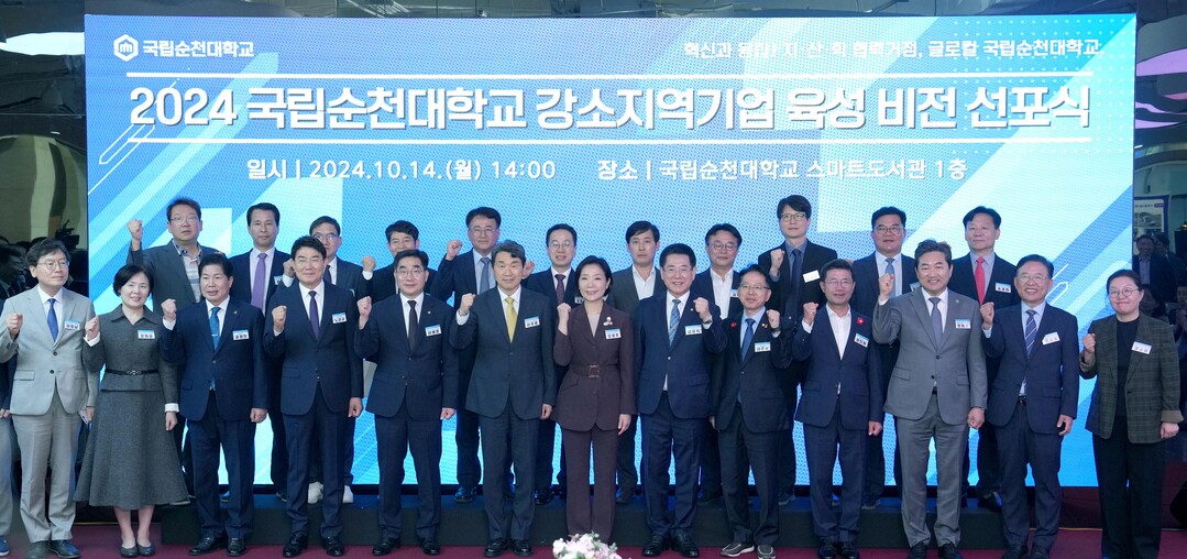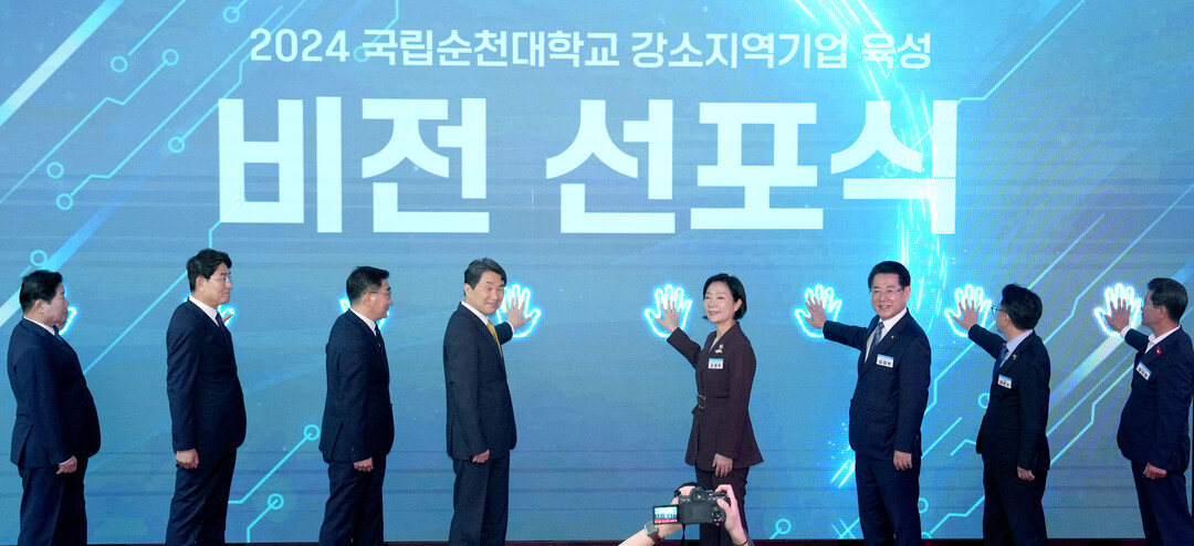 | ▲ '순천대 글로컬대학 강소지역기업 육성 비전 선포식'이 14일 순천대에서 열린 가운데 김영록 전라남도지사가 참석자들과 강소지역기업 육성 퍼포먼스를 하고 있다. |