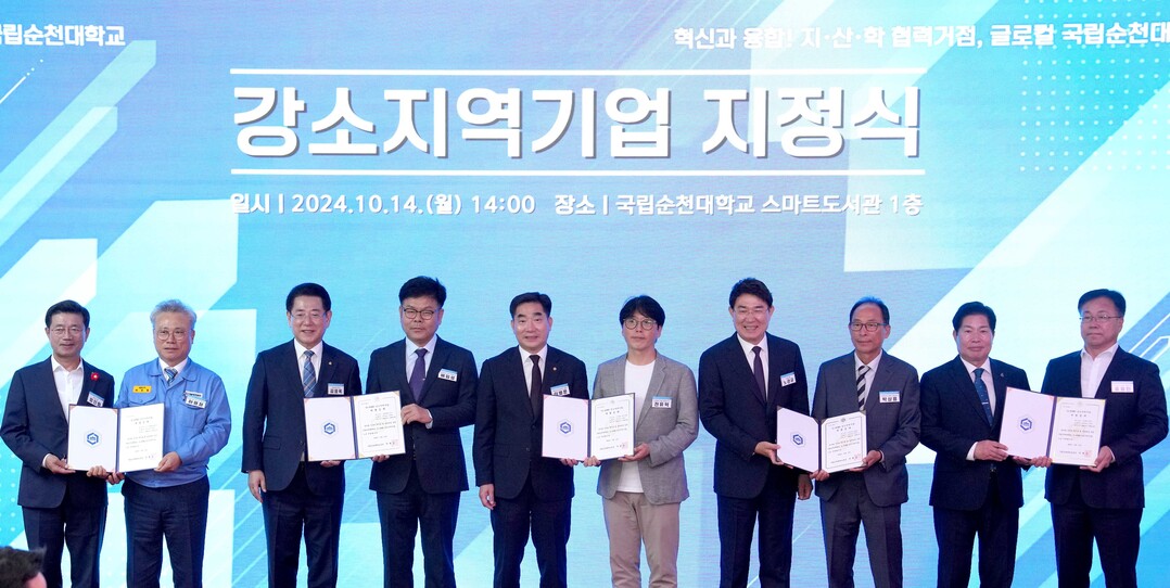 | ▲ '순천대 글로컬대학 강소지역기업 육성 비전 선포식'이 10일 순천대에서 열린 가운데 김영록 전라남도지사가 참석자들과 강소지역기업 지정서를 전달하고 기념촬영을 하고 있다. [전남도 제공] |