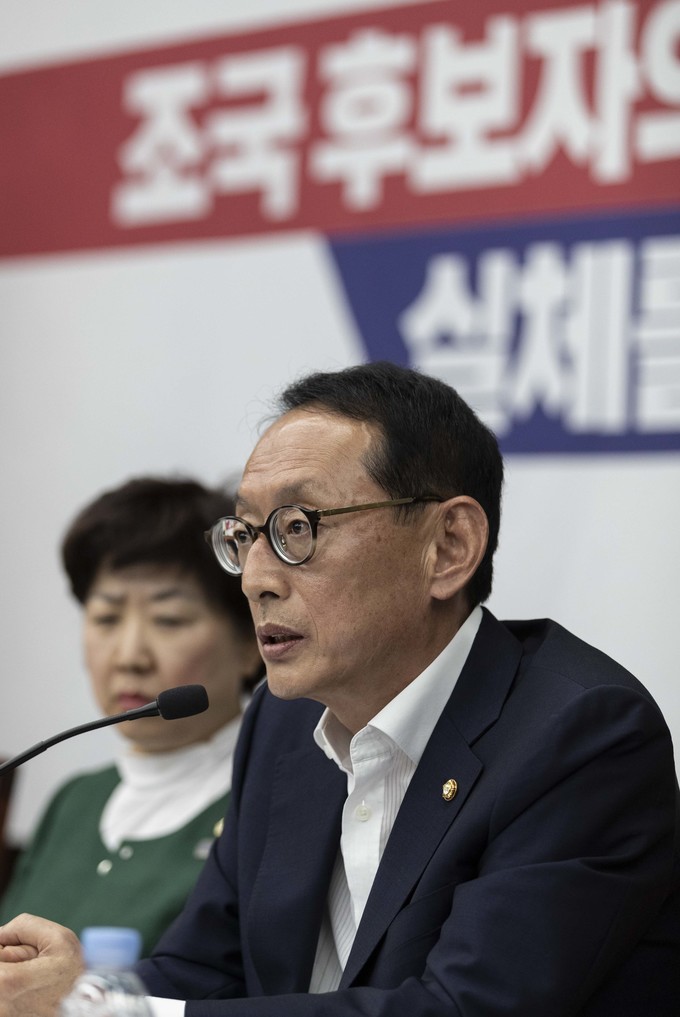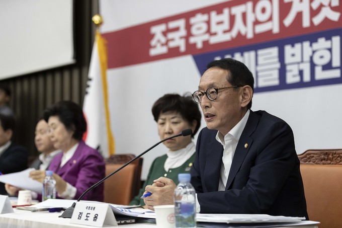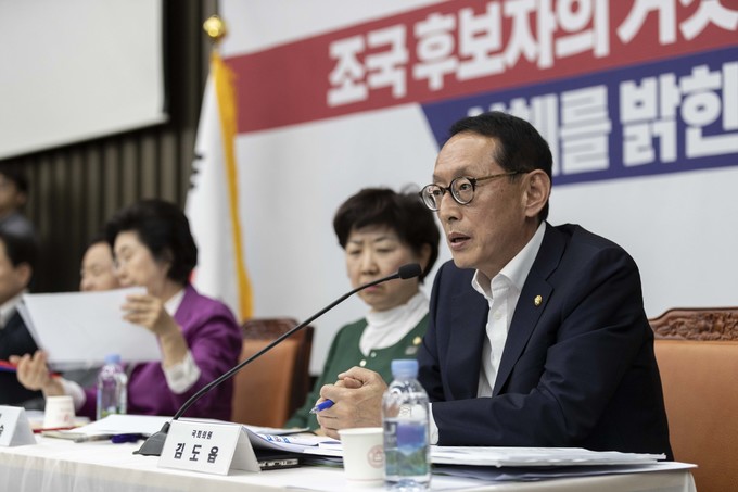자유한국당 김도읍 의원이 3일 오후 서울 여의도 국회에서 열린 '조국 후보자의 거짓과 선동, 대국민 고발 언론 간담회'에 참석해 발언하고 있다.