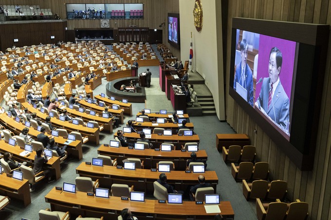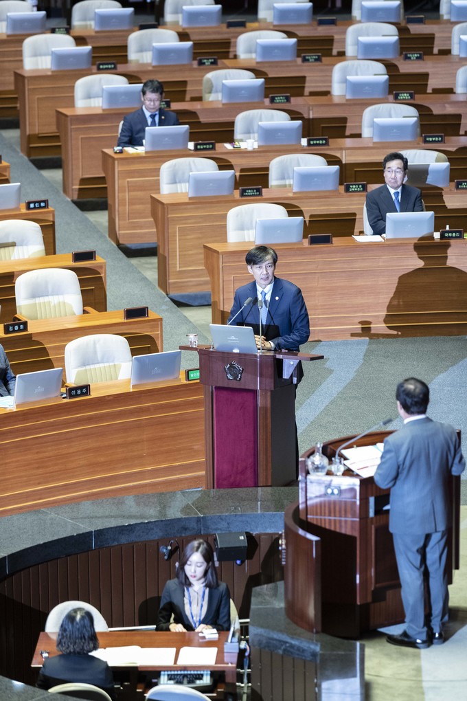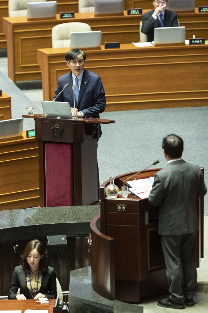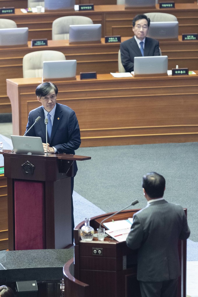 조국 법무부 장관이 26일 오후 서울 여의도 국회에서 열린 제371회 국회(정기회) 제2차 본회의 대정부질문에 출석해 한국당 주광덕 의원 질의에 답하고 있다.