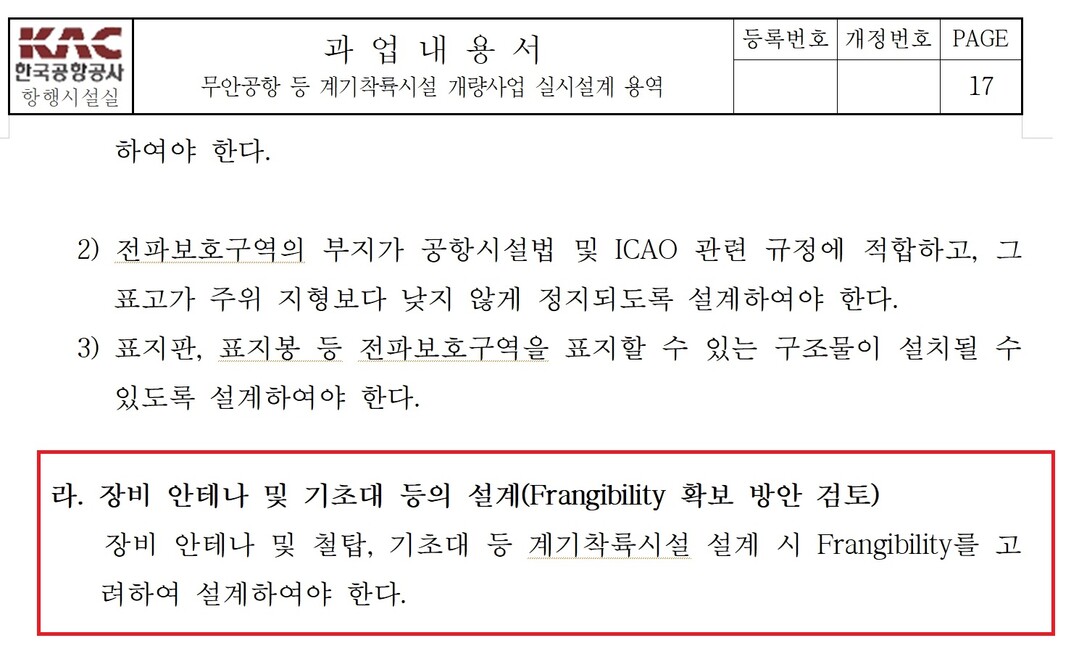 한국공항공사가 지난 2020년 3월3일 입찰 공고한 '무안공항 계기착륙시설 개량사업 실시설계 용역'의 과업내용서를 보면 '장비 안테나와 철탑, 기초대 등 계기착륙시설 설계 시 Frangibility를 (부서지기 쉬움) 고려해 설계해야 한다'는 조건을 내걸었다.