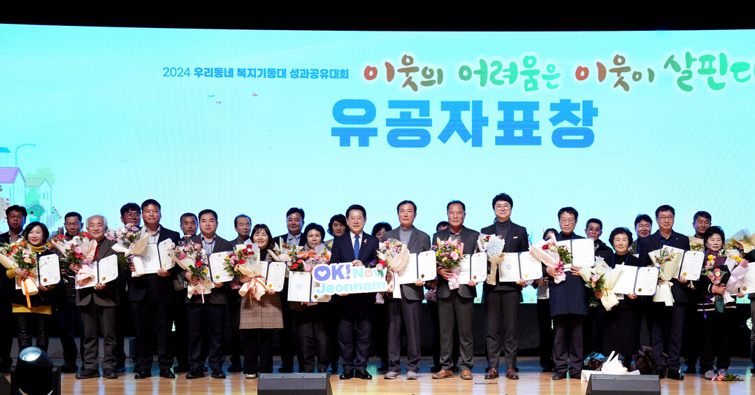 | ▲ 김영록 전라남도지사가 12일 도청 김대중강당에서 열린 '2024 우리동네 복지기동대 성과공유대회'에서 유공자들에게 표창을 수여한 뒤 기념촬영을 하고 있다. [전남도 제공] |
