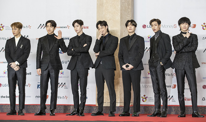 그룹 갓세븐이 28일 오후 인천 중구 파라다이스시티 아트스페이스 플라자에서 열린 ‘2018 AAA(Asia Artist Award)’ 레드카펫 행사에서 포즈를 취하고 있다.