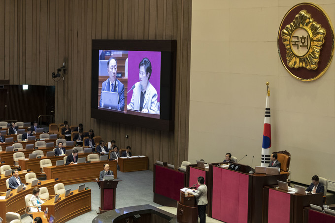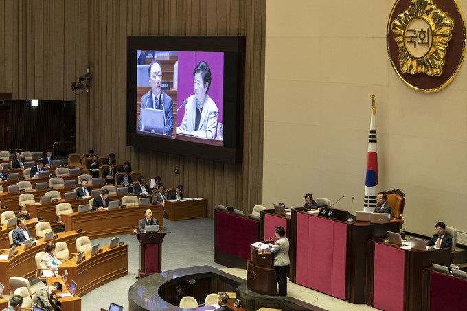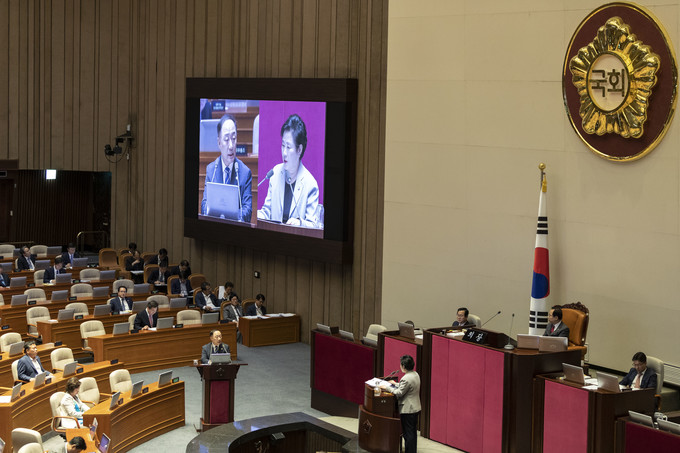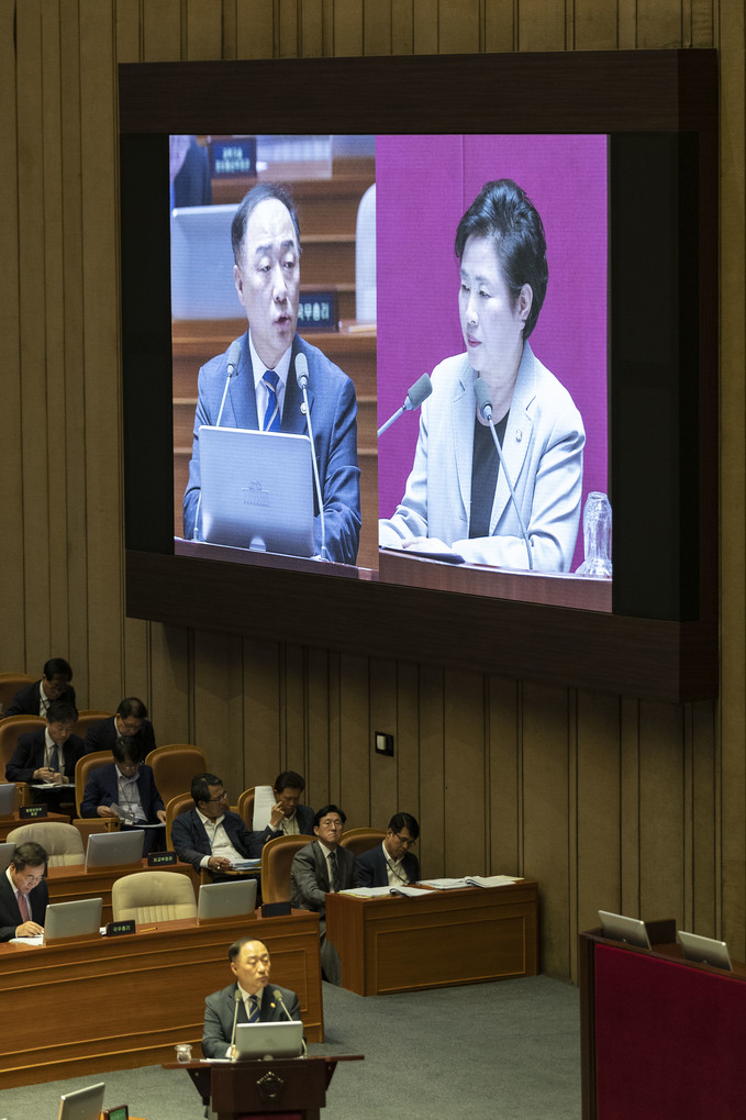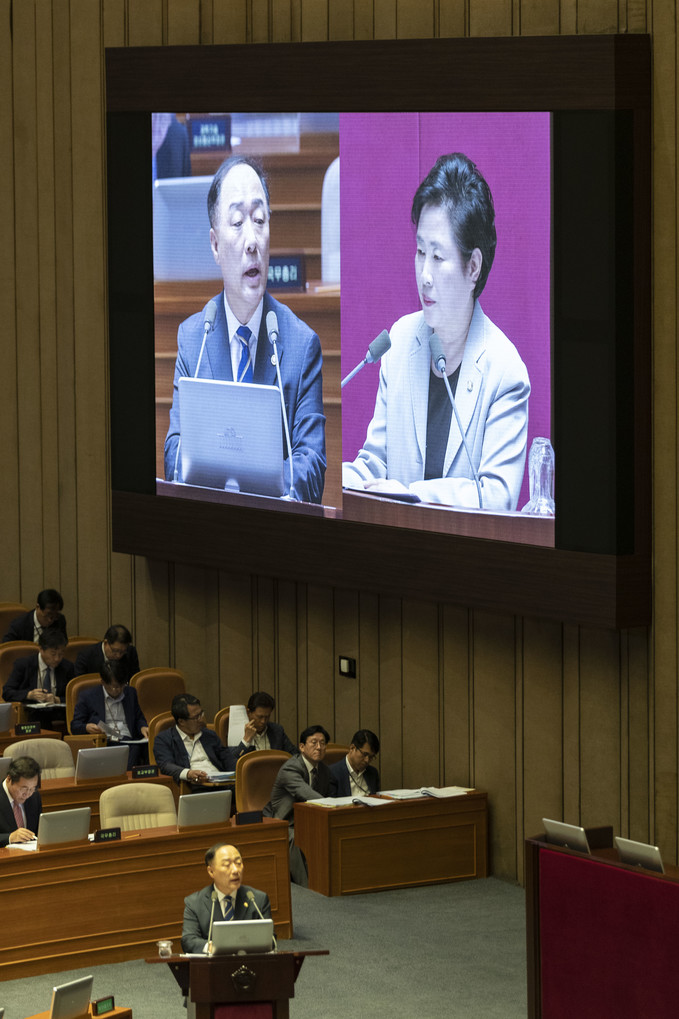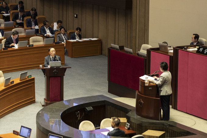 홍남기 경제부 총리(왼쪽)가 10일 오후 서울 여의도 국회에서 열린 본회의 대정부 질문에 출석해 바른미래당 신용현 의원 질의에 답하고 있다.