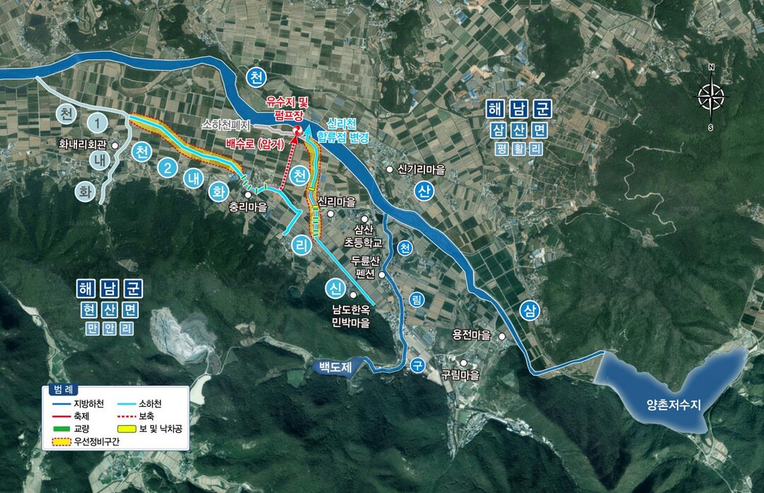 5일 해남군에 따르면 사업비 200억 원이 투입되는 이번 사업은 삼산면 소하천 가운데 침수지역인 신리천과 화내 2천을 정비하고, 삼산천 합류부에 유수지와 펌프장을 설치한다.