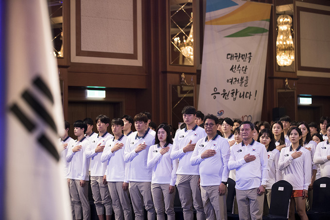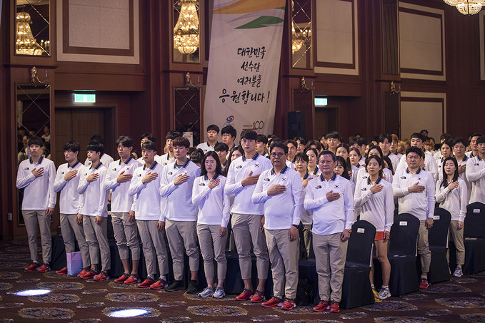 26일 오후 서울 송파구 서울올림픽파크텔에서 열린 2019 제30회 나폴리하계유니버시아드대회 대한민국 선수단 결단식에서 선수단 및 관계자들이 국민의례를 하고 있다.