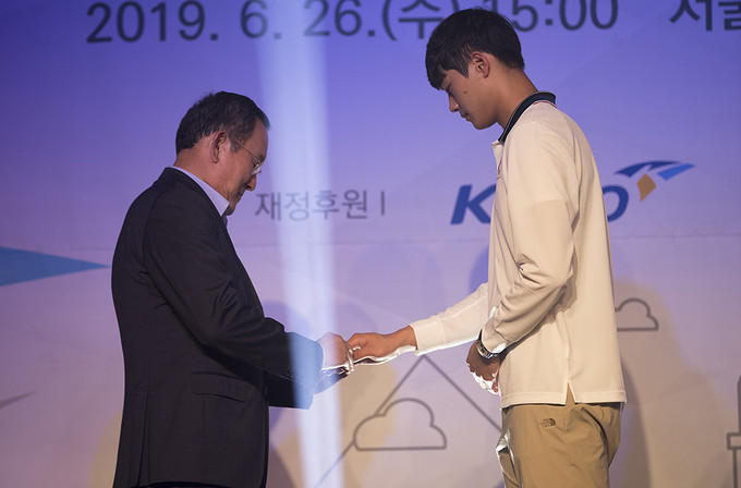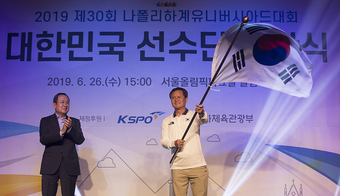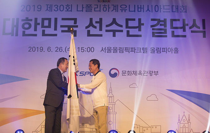 유병진 대한대학스포츠위원회 위원장이 26일 오후 서울 송파구 서울올림픽파크텔에서 열린 2019 제30회 나폴리하계유니버시아드대회 대한민국 선수단 결단식에서 김동민 선수단장에게 단기인 태극기를 수여하고 있다.