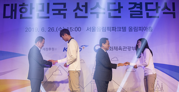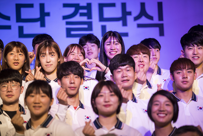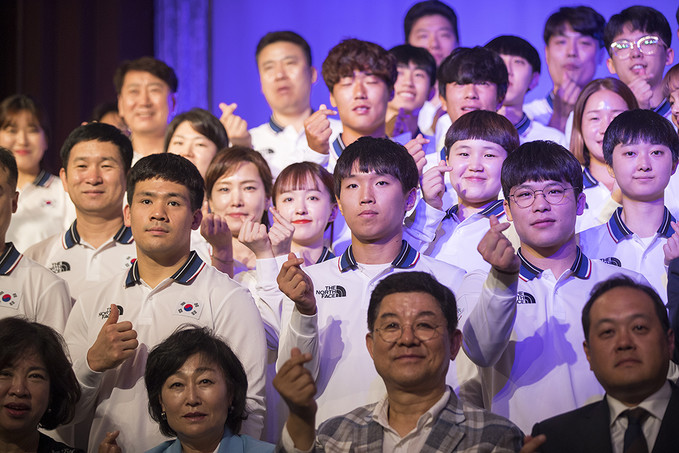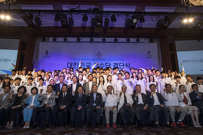 26일 오후 서울 송파구 서울올림픽파크텔에서 열린 2019 제30회 나폴리하계유니버시아드대회 대한민국 선수단 결단식에서 선수단 및 관계자들이 기념사진을 찍고 있다.