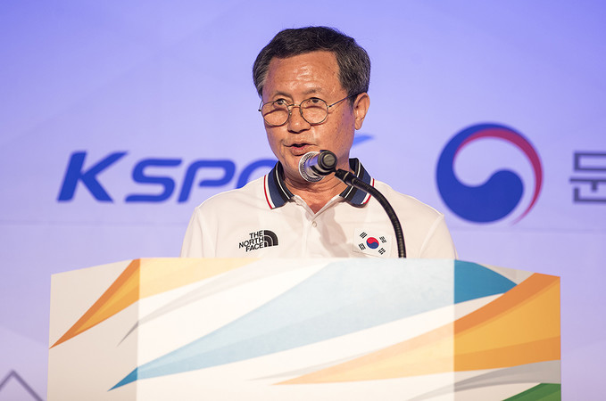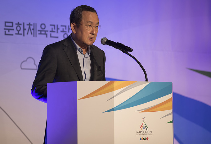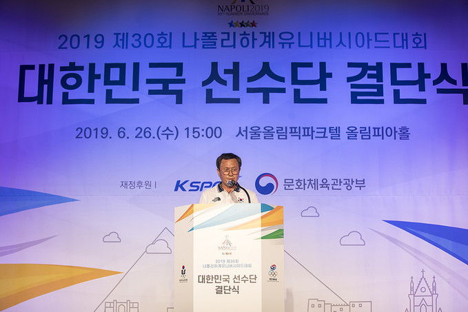 나폴리하계유니버시아드대회 대한민국 선수단 단장을 맡은 김동민 대한대학스포츠위원회 상임위원이 26일 오후 서울 송파구 서울올림픽파크텔에서 열린 2019 제30회 나폴리하계유니버시아드대회 대한민국 선수단 결단식에서 포부를 밝히고 있다.