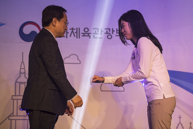유병진 대한대학스포츠위원회 위원장이 26일 오후 서울 송파구 서울올림픽파크텔에서 열린 2019 제30회 나폴리하계유니버시아드대회 대한민국 선수단 결단식에서 선수들에게 소원팔찌를 전달하고 있다.