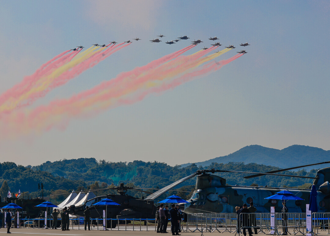 | ▲ ‘K방산’의 위상을 한눈에 확인할 수 있는 국내 최대 항공우주·방위산업 전시회인 ‘서울 아덱스(ADEX) 2023’ 개막을 하루 앞둔 16일 우리 공군의 각종 항공기들이 공중사열을 하고 있다. [이상훈 선임기자] |