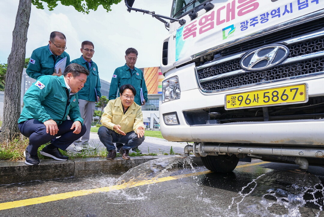 | ▲ 8일 오전 강기정 광주광역시장이 남구 도심 일원에서 김병내 남구청장 등과 지속되는 폭염 대응을 위해 살수차 운행에 대한 현장점검을 실시하고 있다. [광주광역시 제공] |