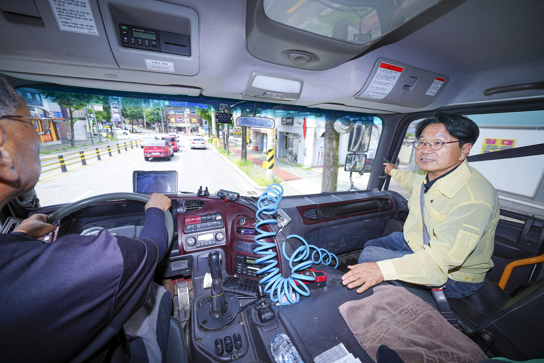 | ▲ 8일 오전 강기정 광주광역시장이 남구 도심 일원에서 지속되는 폭염 대응을 위해 살수차 운행에 대한 현장점검을 실시하고 있다. [광주광역시 제공] |