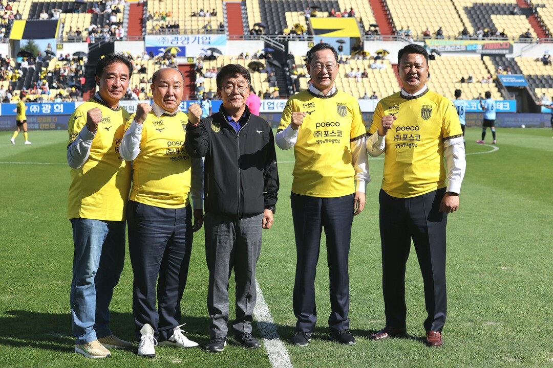 | ▲ 26일 이길운 해남군 체육회장, 이성옥 해남군의회 의장, 김규홍 전남드래곤즈 사장, 명현관 해남군수, 정영필 해남군축구협회장이 '전남드래곤즈와 함께하는 해남군의 날' 행사에서 기념촬영을 하고 있다. [해남군 제공] |