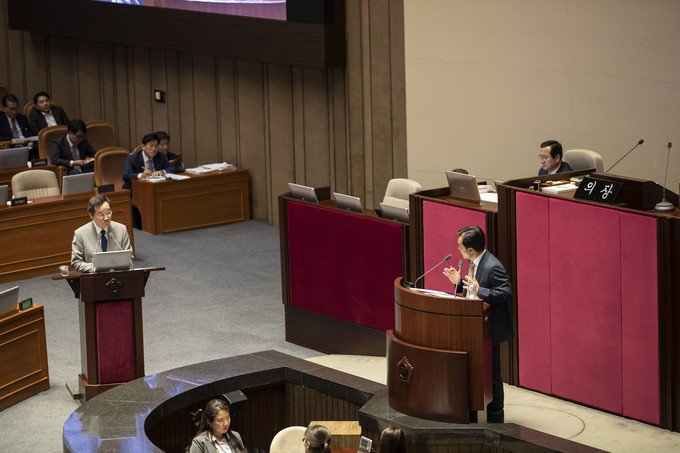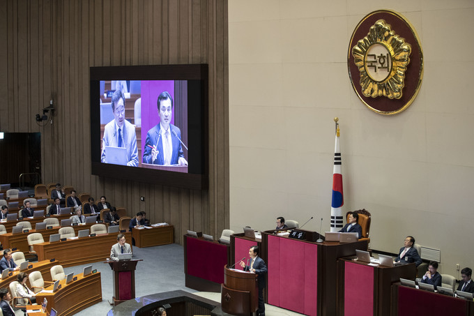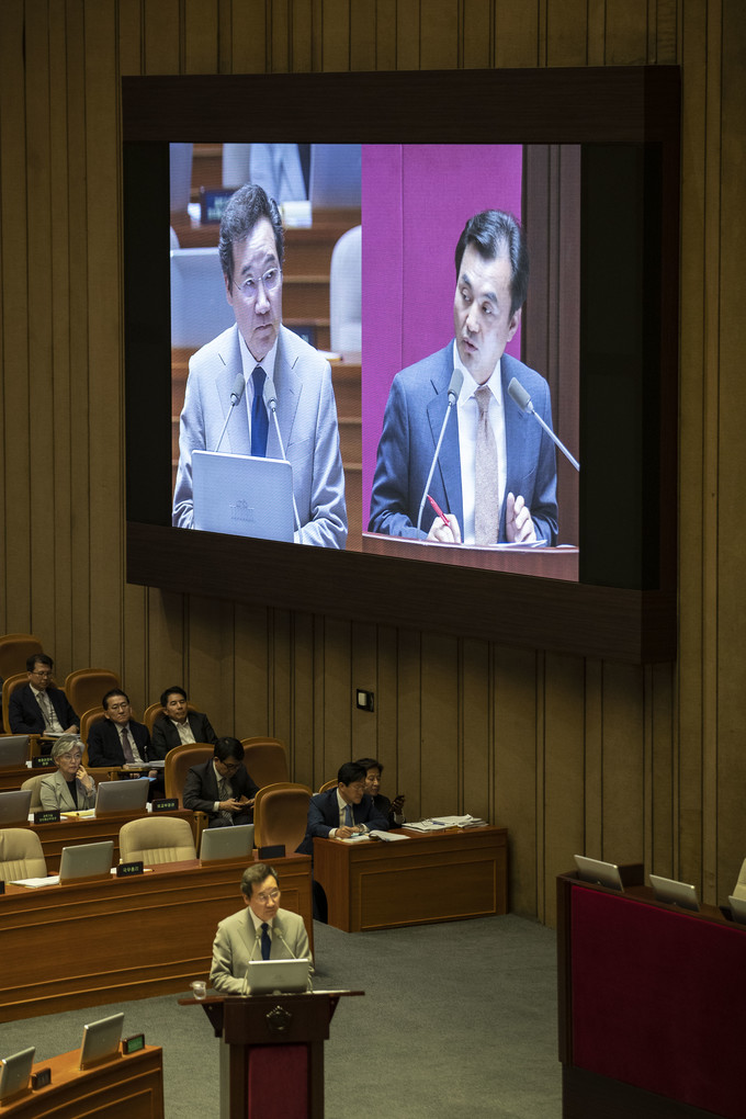 이낙연 국무총리(왼쪽)가 9일 오후 서울 여의도 국회에서 열린 본회의 대정부 질문에 출석해 더불어민주당 안규백 의원 질의에 답하고 있다.