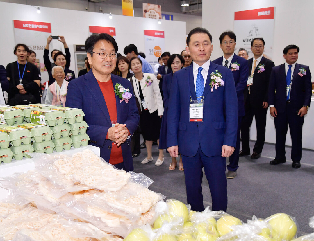 | ▲ 강기정 광주광역시장이 12일 오전 서구 김대중컨벤션센터에서 열린 ‘2023 광주식품대전’ 개막식에 참석해 이종화 대구시 경제부시장 등 내빈들과 전시장을 둘러보고 있다.[광주광역시 제공] |