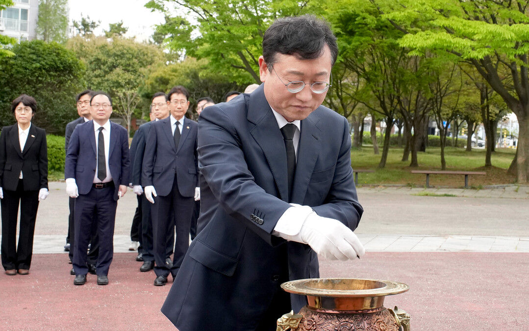 | ▲ 명창환 전라남도 행정부지사가 제65주년 4·19혁명 기념일인 19일 오전 목포시 상동 달맞이공원 4·19민주혁명 기념비를 찾아 헌화 분향하고 있다. [전남도 제공] |