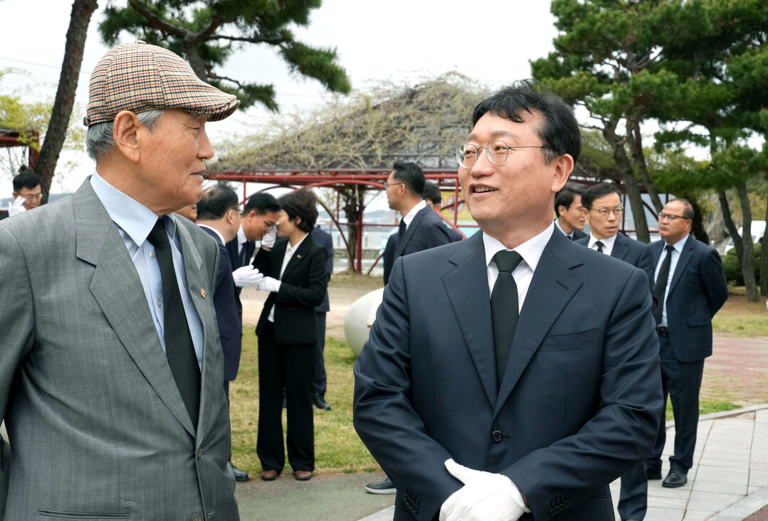 | ▲ 명창환 전라남도 행정부지사(오른쪽)가 제65주년 4·19혁명 기념일인 19일 오전 목포시 상동 달맞이공원 4·19민주혁명 기념비를 찾아 민주열사 후손들과 대화를 나누고 있다. [전남도 제공] |
