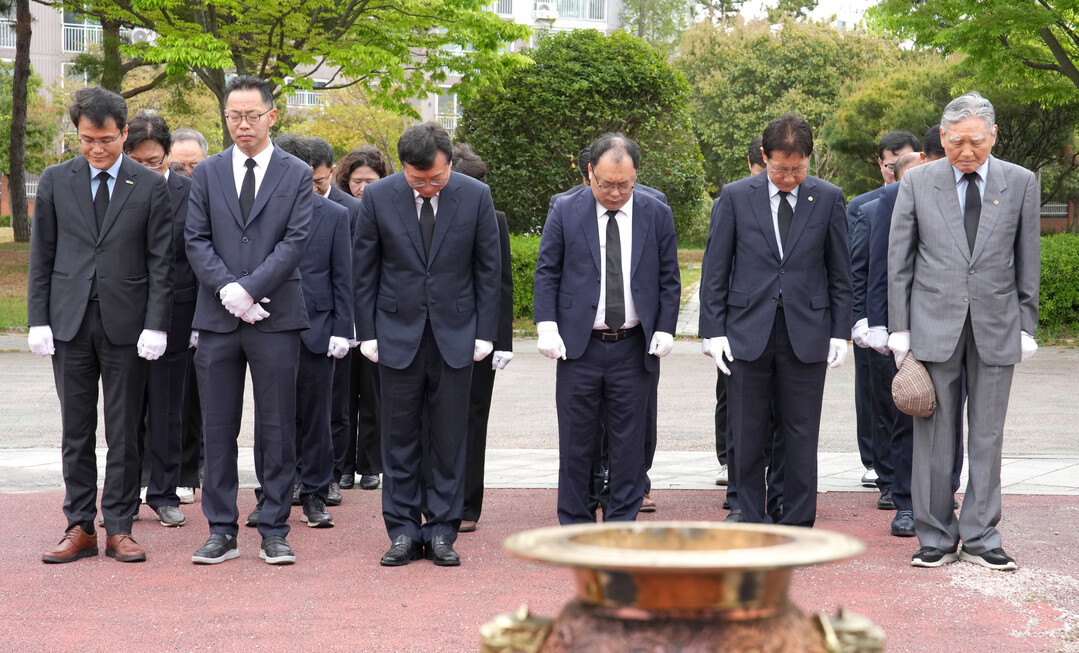 | ▲ 명창환 전라남도 행정부지사를 비롯한 전라남도 실국장 등 4·19혁명 민주열사 후손들이 19일 오전 목포시 상동 달맞이공원 4·19민주혁명 기념비를 찾아 묵념하고 있다. [전남도 제공] |
