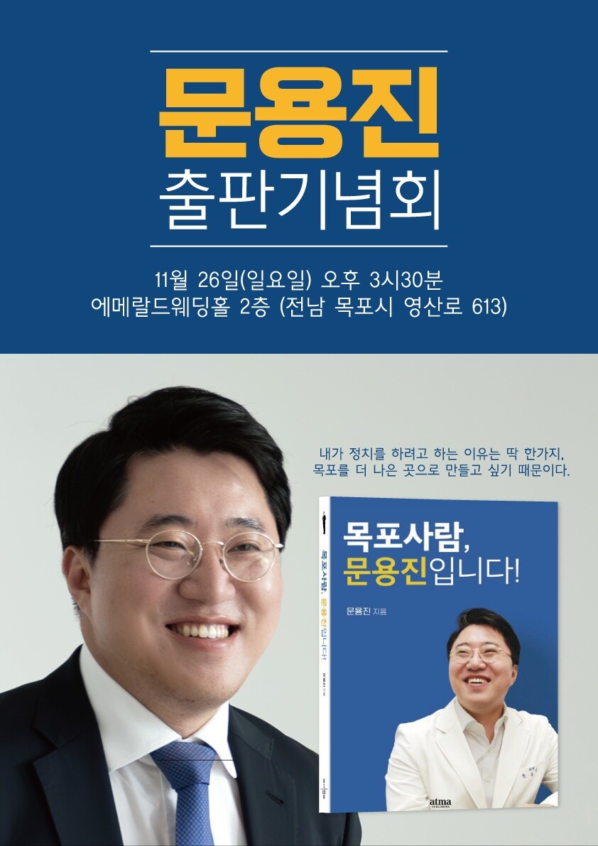 문용진 부부요양병원 병원장이 '목포사람 문용진입니다'라는 제목의 책을 발간해 오는 26일 오후 3시 30분 목포 에메랄드 웨딩홀 2층에서 출판기념회를 개최한다.