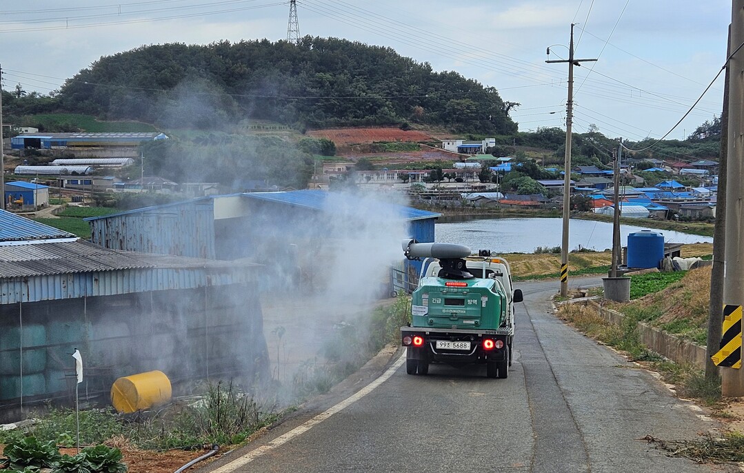| ▲ 해남 공동방제단이 소 농가에 연무소독을 하고 있다. [전남도 제공] |