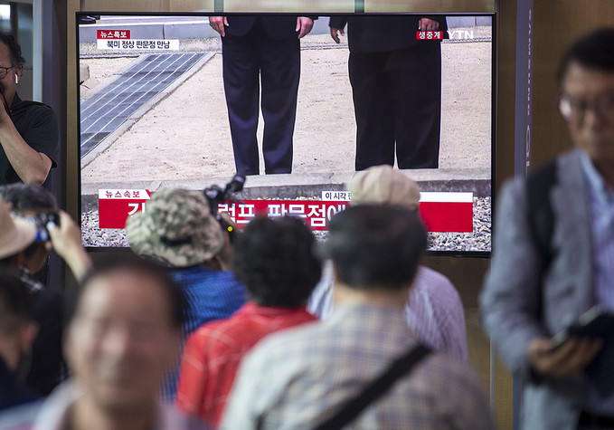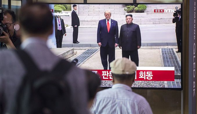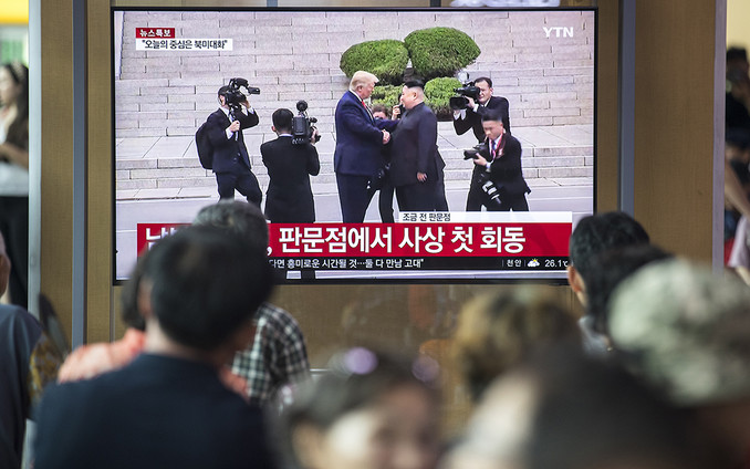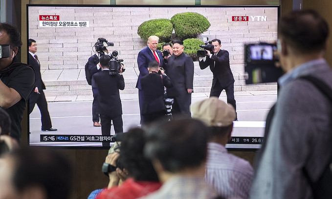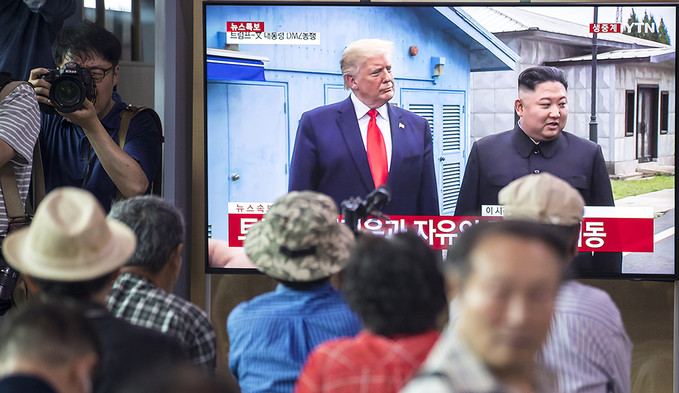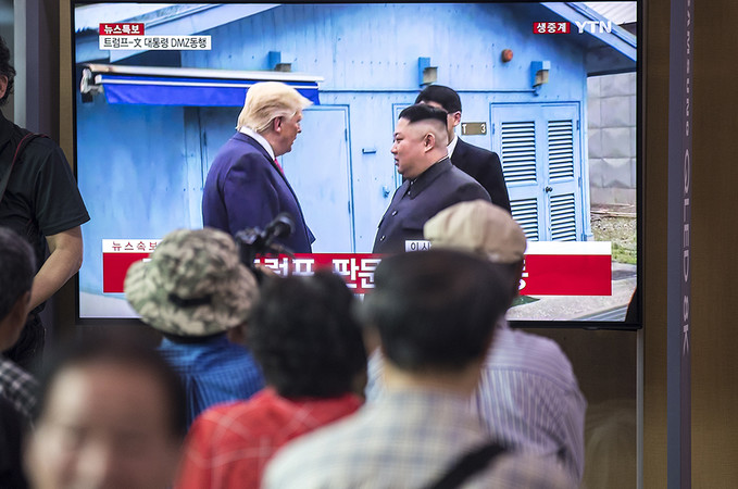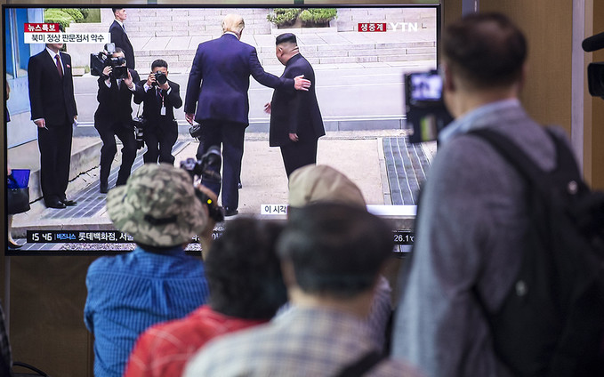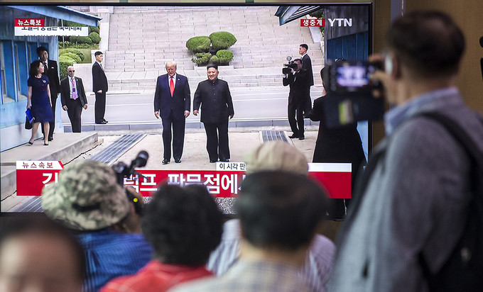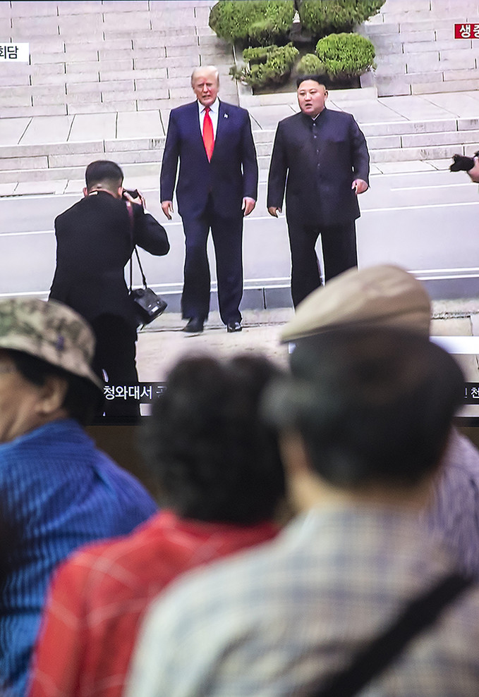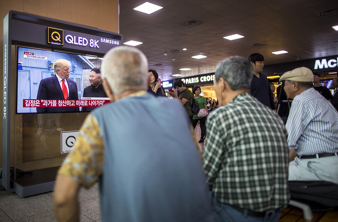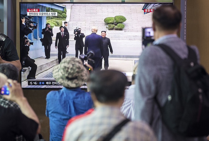 30일 오후 서울 용산구 서울역 대합실에서 TV를 통해 시민들이 도널드 트럼프 미국 대통령과 김정은 북한 국무위원장이 만나는 모습을 보고 있다.