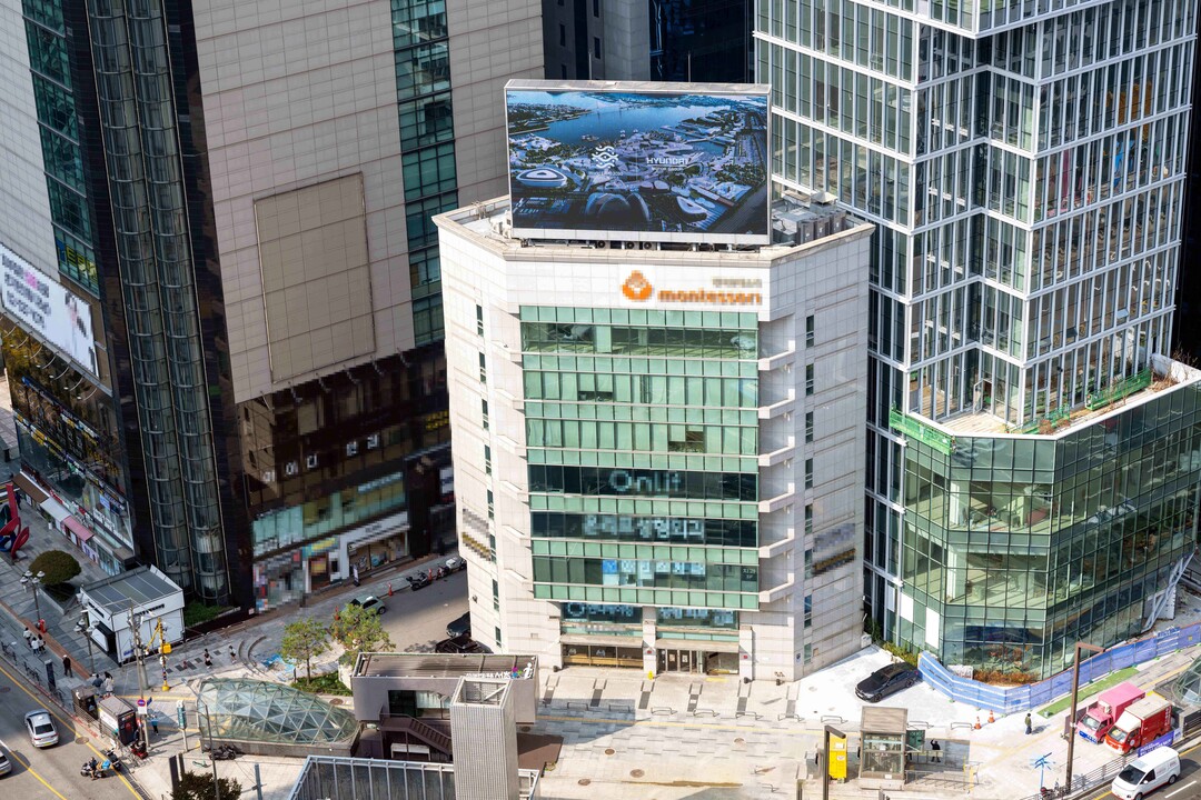 | ▲ 서울 서초구 강남역 사거리 인근 빌딩 옥상에 설치된 대형 옥외광고에 현대차그룹의 부산세계박람회 유치 홍보 영상이 상영되고 있다. [현대차그룹 제공] |