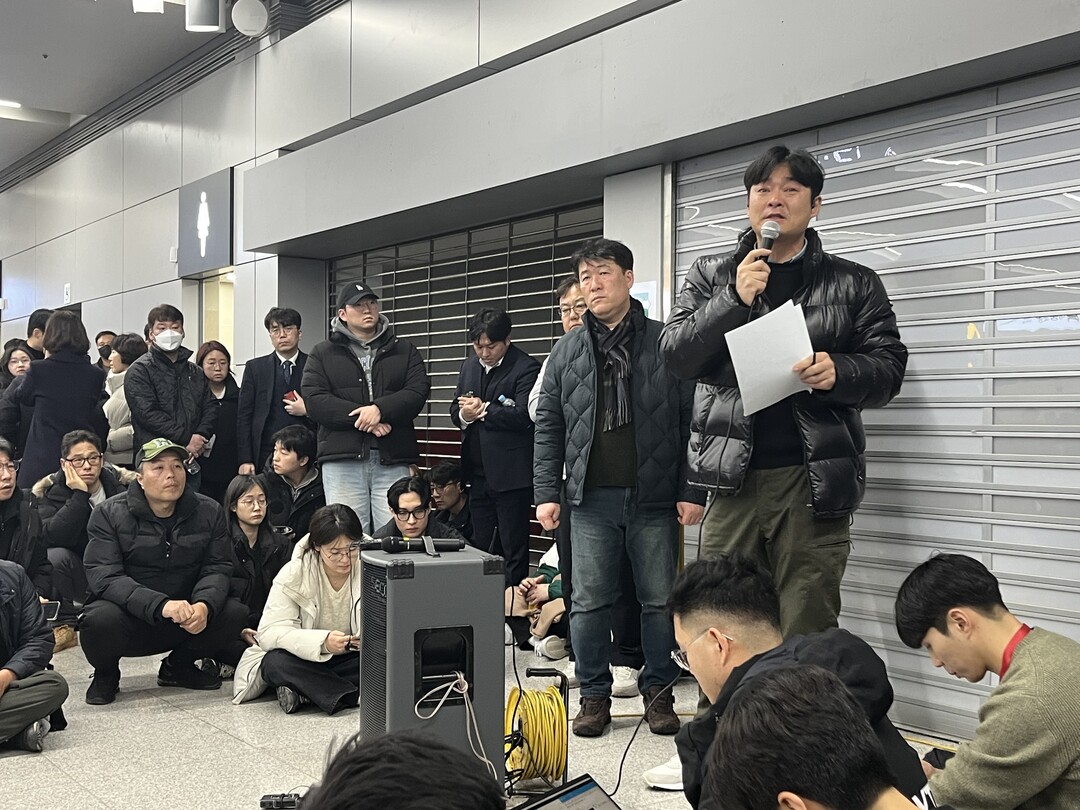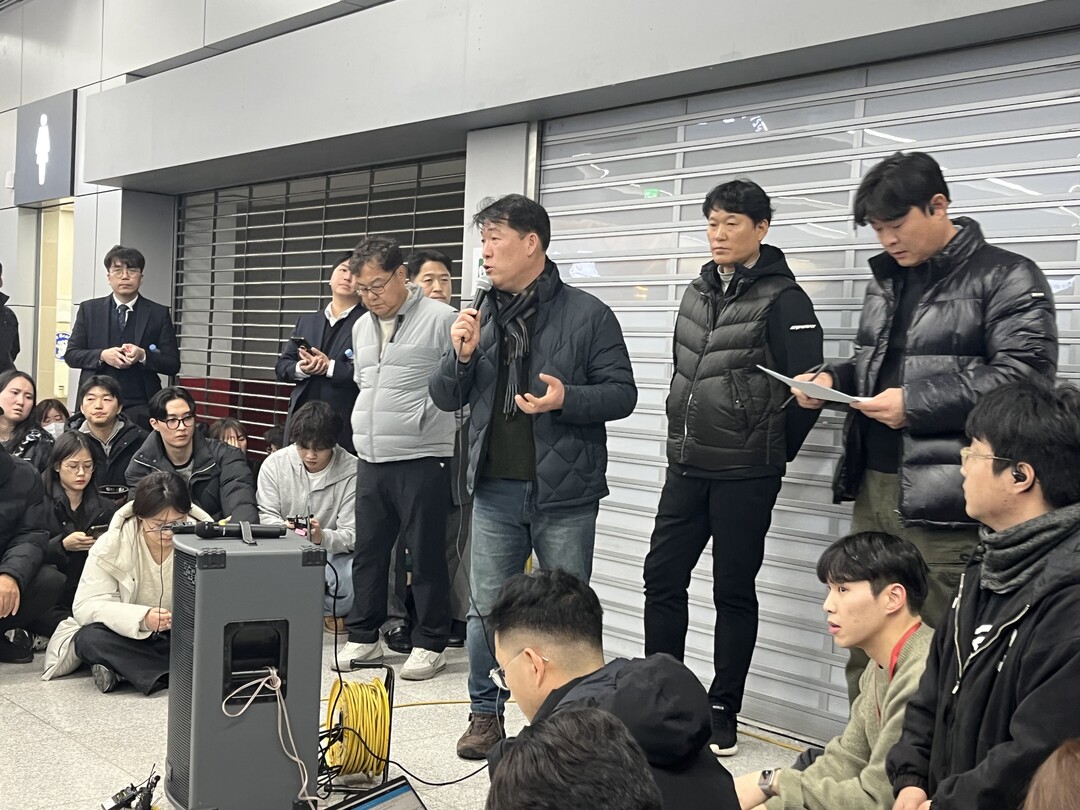 | ▲ 29일 무안국제공항 유가족 대기실에서 유가족 대표가 "제주항공 대표는 서울에서 브리핑을 하지 말고 현장에 직접 내려와야 한다"고 촉구하고 있다. 해당 유가족은 친형이 사고 여객기에 탑승했다. [강성명 기자] |