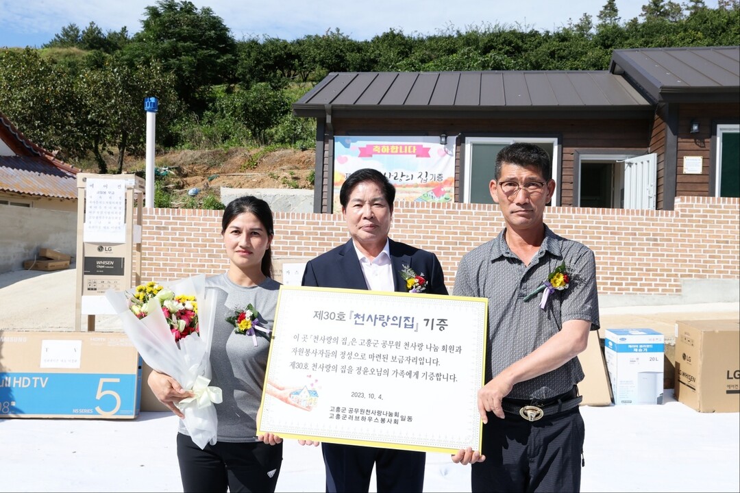 ‘제30호 천사랑 나눔 사랑의 집’은 61.65㎡ 규모의 조립식 주택으로, 공무원의 자발적인 성금을 비롯해 러브하우스팀의 건축 공사, 혜인건축사 사무소의 건축설계, LX국토정보공사 고흥지사의 지적측량 등 재능기부와 주민들의 생활용품 기증 등 사랑과 온정이 어우러져 완공됐다.
