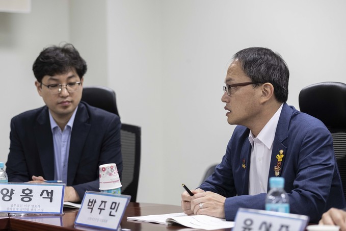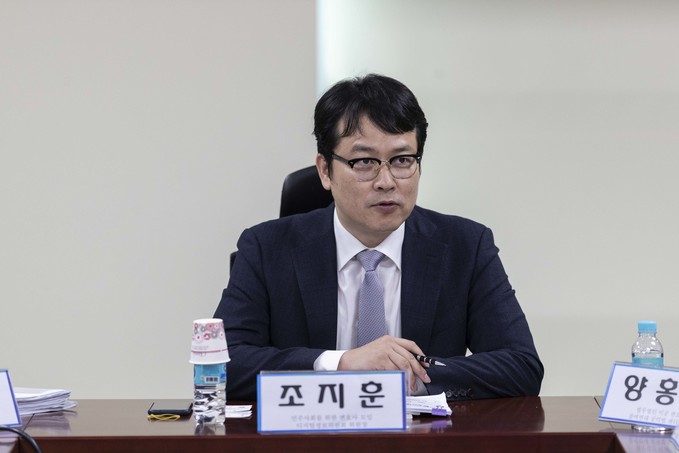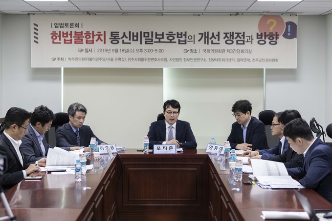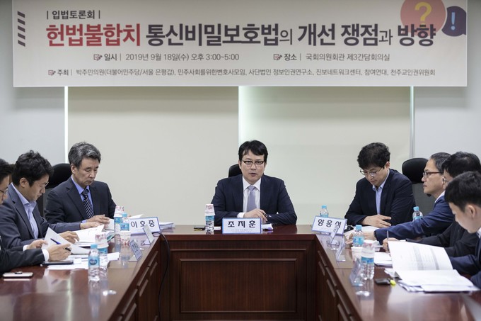조지훈 민주사회를위한변호사모임 디지털정보위원회 위원장(가운데)이 18일 오후 서울 여의도 국회 의원회관에서 열린 '통신비밀보호법의 개선 쟁점과 방향' 입법토론회에 참석해 발언하고 있다.