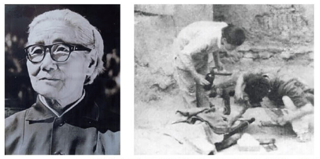 | ▲ 노년의 이화림(왼쪽 사진), 이화림이 다친 대원을 응급 처치하는 모습. [독립기념관 홈페이지 갈무리] |