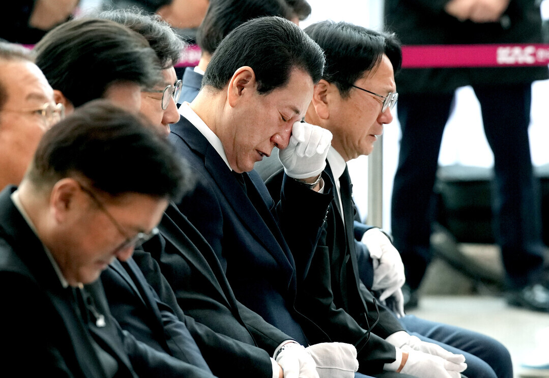 | ▲ 김영록 전남도지사와 강기정 광주광역시장이 지난달 18일 무안국제공항에서 열린 '제주항공 여객기 참사 희생자 합동 추모식'에서 유가족 편지를 들은 뒤 눈물을 닦고 있다. [전남도 제공] |