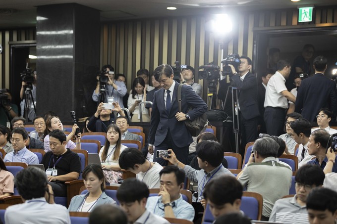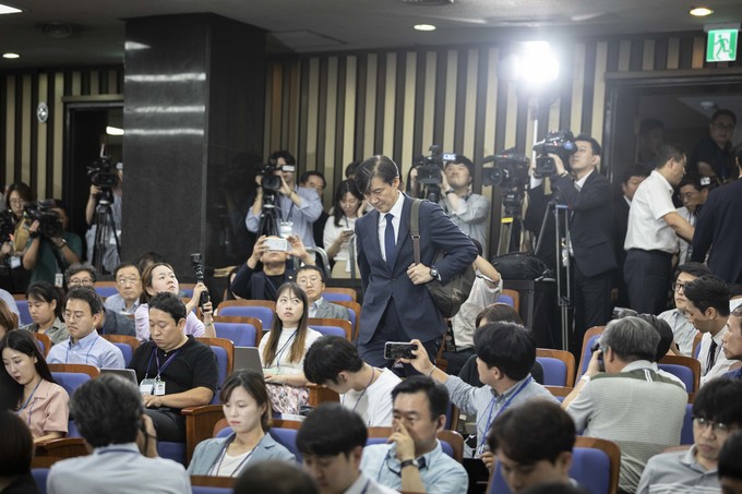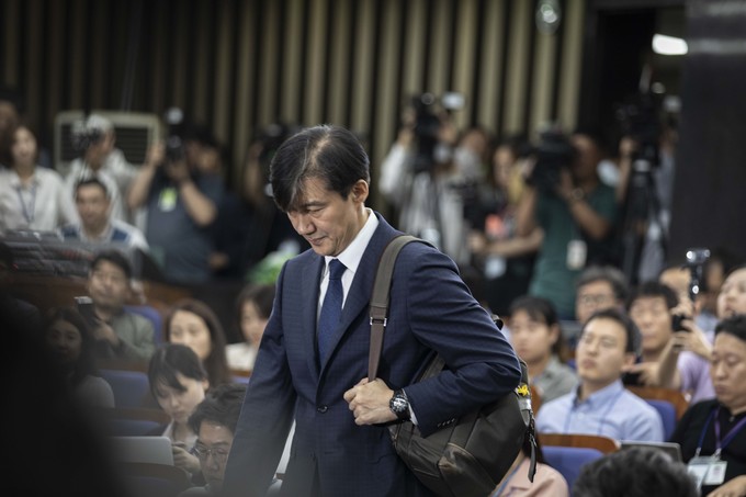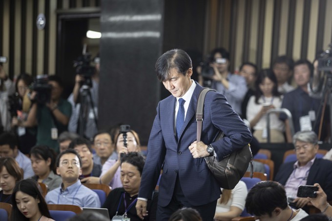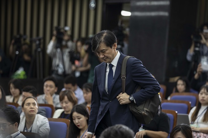 조국 법무부 장관 후보자가 2일 오후 서울 여의도 국회에서 예정된 기자회견을 위해 회의장으로 들어오고 있다.