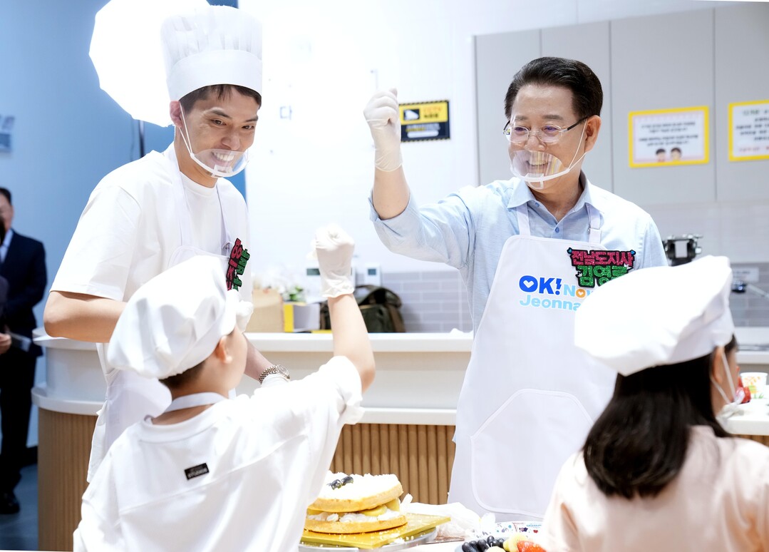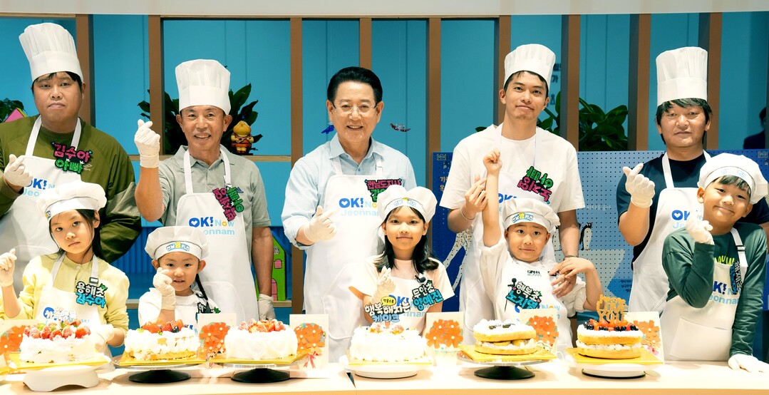 | ▲ 김영록 전라남도지사가 27일 무안군 가족센터에서 열린 '가정의 달 기념 어린이 쿠킹 클래스'에 참석, 아이들과 케이크를 만들고 있다. [전남도 제공] |